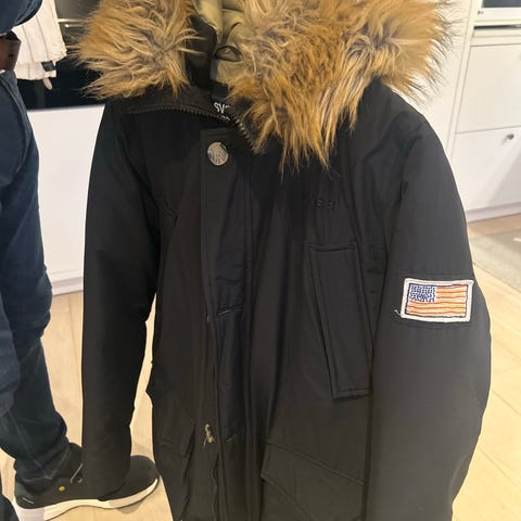 Svea vinterjakke i størrelse L, farge svart. Jakken er laget med dun som isolasjonsmateriale, egnet for kalde værforhold.