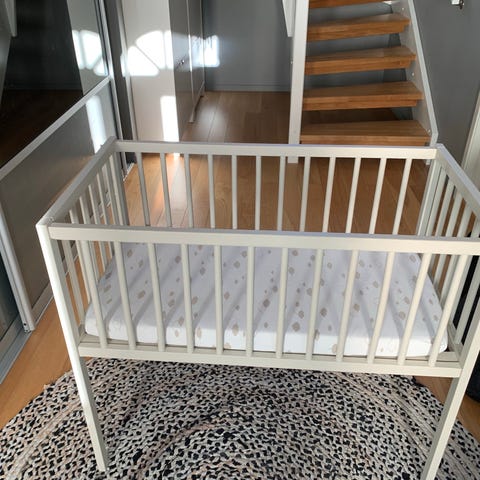 IKEA Sundvik sprinkelseng i hvit farge. Kan senkes og heves i tre ulike nivå.