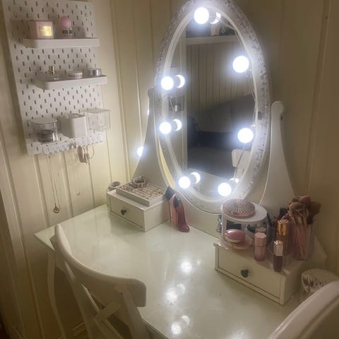 Sminkebord med speil og krakk i hvitt