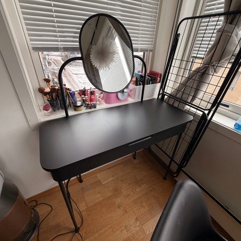 Sminkebord med tilhørende speil og krakk. Bordet har skuffer for oppbevaring og er malt i hvit farge. Passer til bruk som sminkebord eller som et mindre skrivebord.