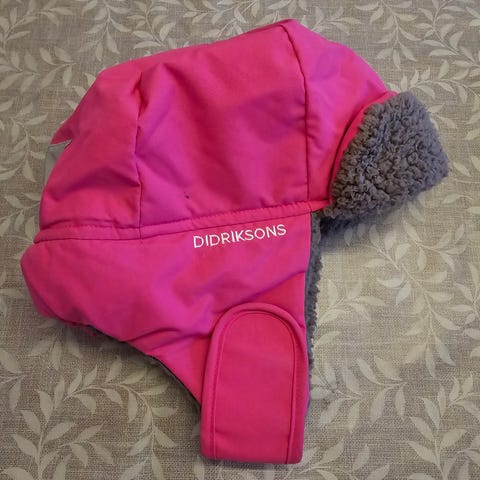 Didriksons lue i størrelse 56 for jente. Luen er rosa og laget av polyester. Godt brukt.