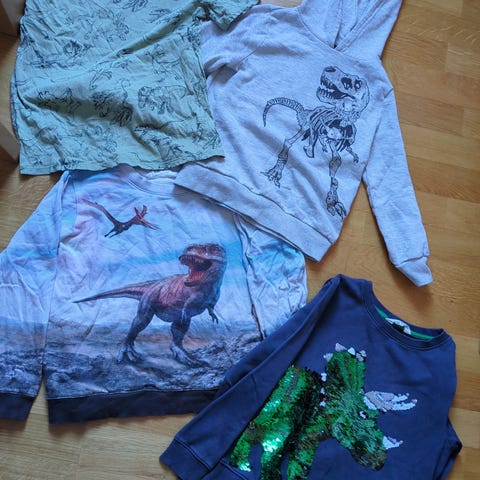 Fin klespakke til en som liker dinoer. Bukser, genser, tskjørter med lang og kort ermer. Ingen hull, flekker.