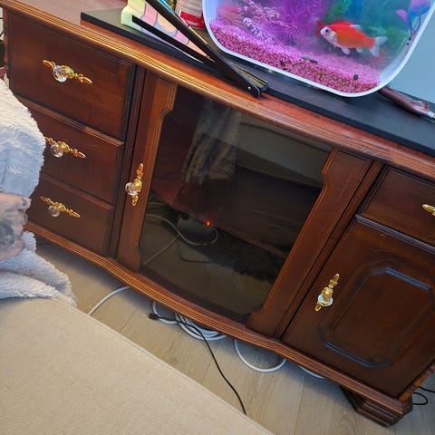 Pen skjenk med et lite bord i samme treverk gies bort.