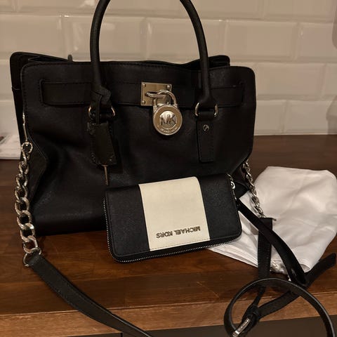 Michael Kors dameveske laget i svart lær. Vesken har justerbare stropper og metalliske detaljer med Michael Kors-logo. Passer til daglig bruk og ulike anledninger. Pris kan diskuteres ved hurtig avgjørelse helst 3000 siden den er som ny går ikke lavere en 2500
