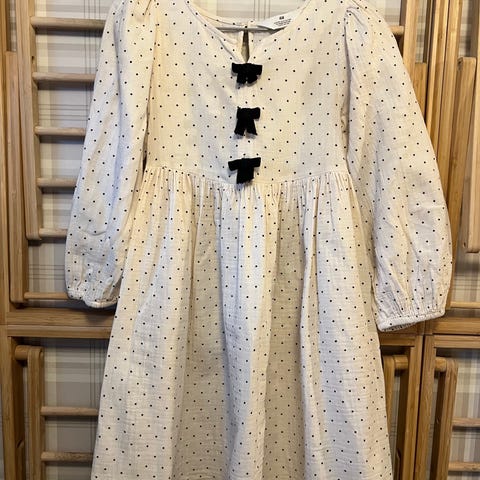 H&M barn kjole i størrelse 134 for jente. Kjolen er hvit og laget av polyester. Den har et mønster med stjerner og knapper på baksiden. Egnet for barn i denne størrelsen.