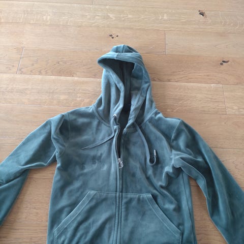 Va Vite hettegenser for dame i størrelse S. Genseren er grønn og laget av polyester. Den har hette med snorer og glidelås foran, samt lommer. Passer til hverdagsbruk. Den er aldri brukt.
