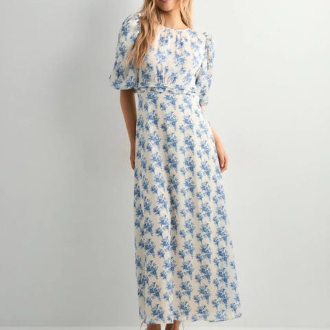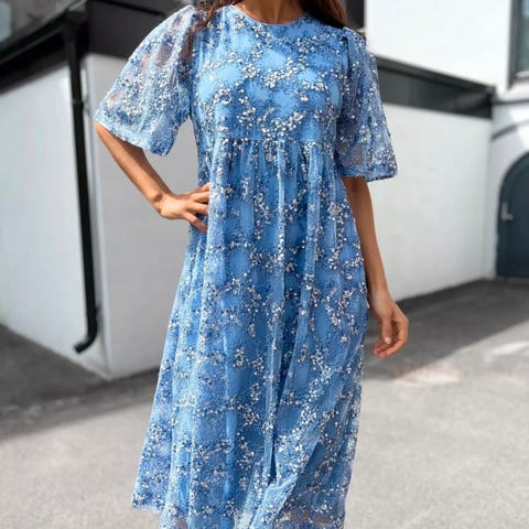 Nydelig kjole fra Cras til sommerfesten eller bryllup. Kun brukt i kirken under en vielse, ca. 1,5 time. Kort lilla underkjole i bomull. Gjennomsiktig overkjole med blomster og knyting i ryggen.
