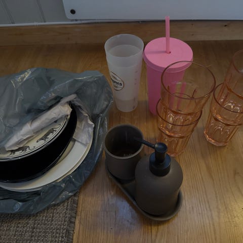 Esken består av kjøkkenutstyr, mopp, bokholder, holder til mac, bordlampe, lommebok, håndduker, såpeholder til dusj, m.m. Se bilder.