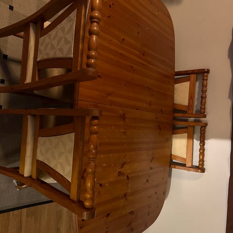 Spisegruope med 4 stoler og ileggsplate. Godt brukt. Noe slitasje.