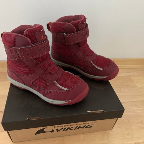 Viking barnestøvler for jente i størrelse 29. Støvlene er lilla og designet for barn, med borrelåsfester for enkel på- og avkledning.