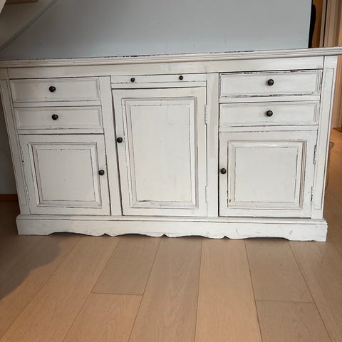 En hvit og pen benk/skjenk/hylle med tre oppbevaringsbokser nederst selges. Det er noen få partier på møbelet hvor malingen er blitt skrapt vekk (små groper). God oppbevaringsplass.