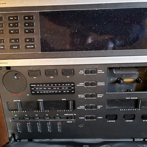 Bang & Olufsen stereoanlegg med tilhørende høyttalere. Anlegget har et klassisk design med trepaneler og flere kontrollknapper for justering av lyd. Høyttalerne er rektangulære med svart stofftrekk.