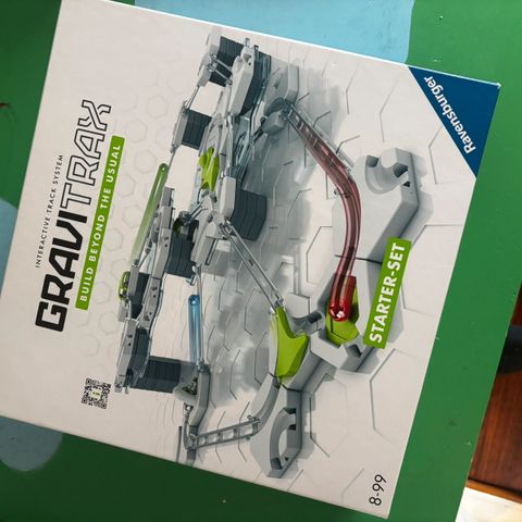 Gravitrax Starter-sett barnespill. Et konstruksjons- og spillsett som lar barn bygge og eksperimentere med kuler som beveger seg gjennom ulike baner. Passer for barn fra 8 år og oppover.