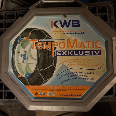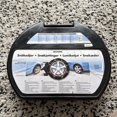 Thule snøkjettinger til bil, lagret i en rund oppbevaringsboks. Kjettingene har fargede plastdeler for enkel montering og justering. Egnet for bruk på vinterføre for bedre veigrep.