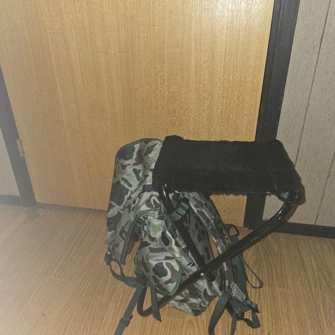 Ryggsekk med sammenleggbar stol med kamuflasjemønster på stoffet. Stolen er egnet for utendørs bruk som jakt, camping eller fisking.