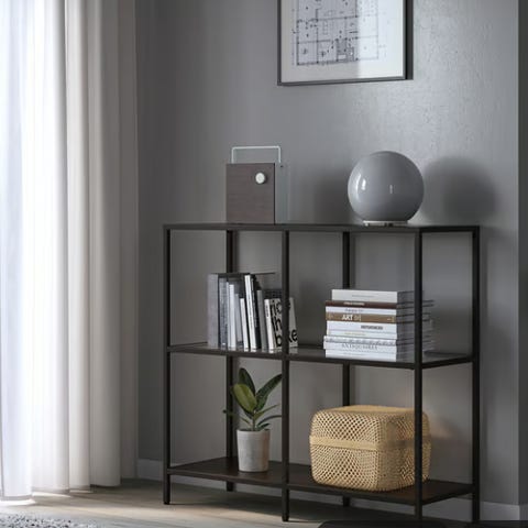 3 stk VITTSJÖ hyller fra IKEA. Brunsvart hylle i topp og bunn på alle. De to smale har 3 glasshyller, den lave har 1 stor glasshylle i midten.