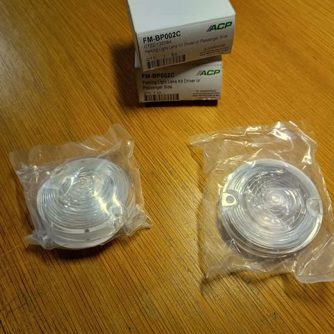 1964-66 Mustang parklys glass sett, med pakning og skruer. Orange, ny, repro, C5ZZ-13208-A, pris kr 140.