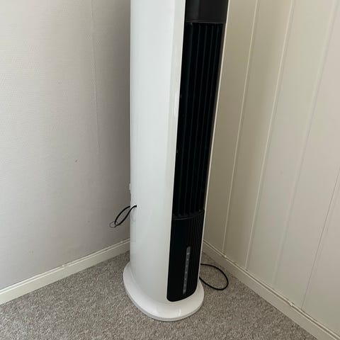 Utstyrt med flere kontrollknapper på toppen for justering av luftstrøm og hastighet. Designet for å sirkulere luft effektivt i rom.