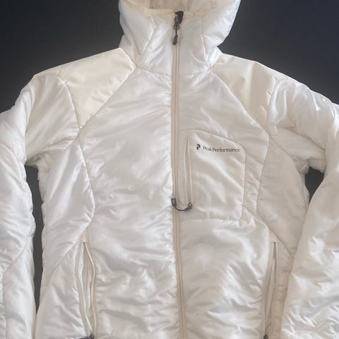 Mos Mosh kåpe størrelse XS, farge grå, laget av dun. Plagget er designet for kvinner og egner seg som yttertøy for kaldere vær. Jakken har hette og lang lengde for ekstra beskyttelse.