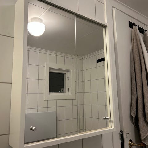Speilskap i hvit utførelse med speil på fronten. Inneholder flere glasshyller for oppbevaring. Designet for å henges på vegg, egnet for baderom eller andre rom som krever speil og oppbevaringsplass. Skapet er fra IKEA. Høyde 98, Bredde 63, Dybde 14.