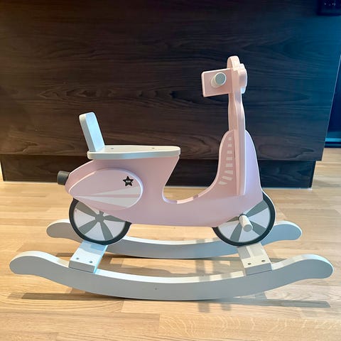 Rosa sykkel/kjøretøy med tilhenger i tre