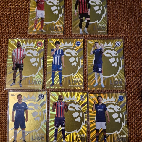 Selger en samling på ca. 250 fotballkort fra diverse serier og år. Mange kjente spillere og klubber. Kortene fremstår som pent behandlet.
