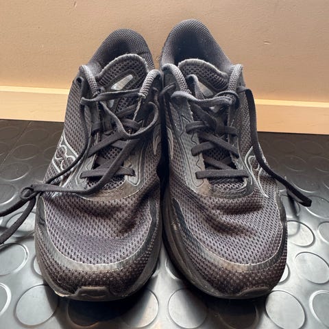Saucony løpesko i størrelse 42,5, designet for løping. Skoene har en kombinasjon av hvit, gul og blå farge, og er laget med materialer som gir støtte og komfort under løpeaktiviteter.