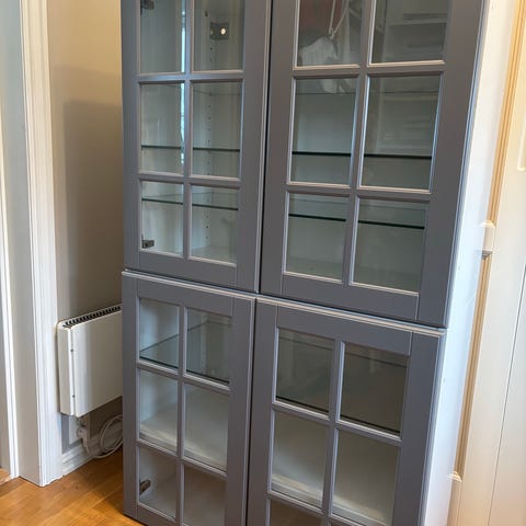 Skap med to hyller, ramme i stål/aluminium farve blå, glasskap.