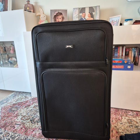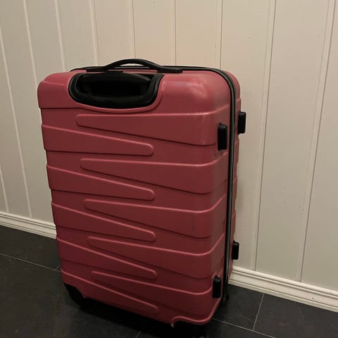 Sort hardplast koffert. Str. 25/40/60. Alle funksjoner ok; hjul, forlenget håndtak og lås med kode.