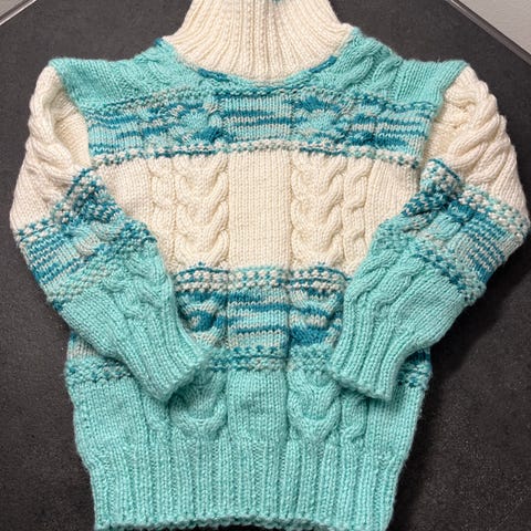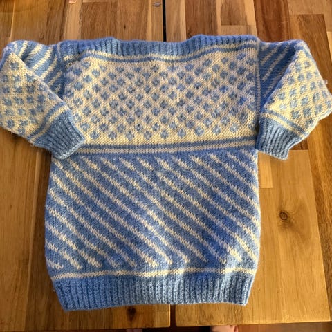 Hjemmestrikket genser for barn i størrelse 86. Genseren har flerfarget mønster og er laget av 80% polyester og 20% ull. Passer for både jenter og gutter. Kan sendes mot frakt eller kan hentes på Skøyen eller Asker togstasjon. Se gjerne mine andre annonser :)