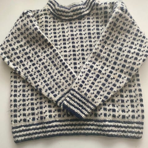 barnegenser er hjemmestrikket i 80%polyester og 20% ull, flerfarget, størrelse one size, unisex. Genseren har kabelstrikket mønster og høy hals, egnet for barn. Kan hentes på Asker eller Skøyen togstasjon, eller kan sendes mot frakt. Se gjerne mine andre annonser