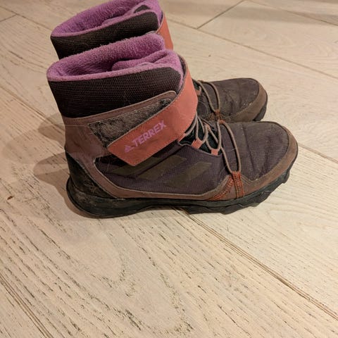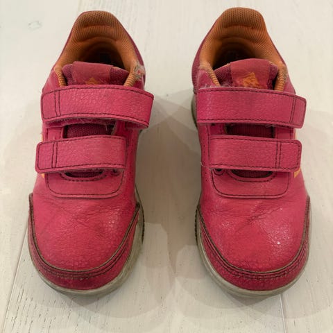 Adidas barnesko for jente i størrelse 33. Skoene har rosa farge med oransje detaljer . Modellen har borrelas for enkel pa- og avkledning.