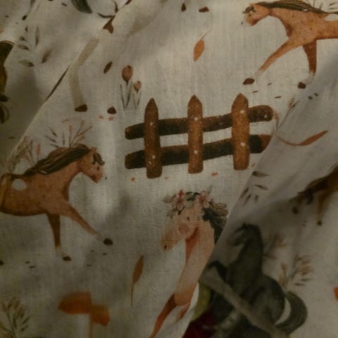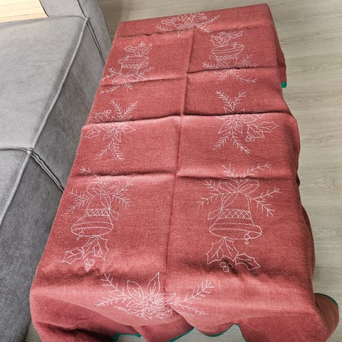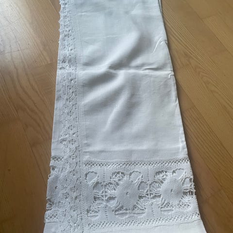 Midt på duken er det desverre et hull, se bildet. Duken måler ca. 140+230cm med fall.