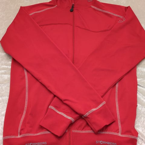 Stormberg «treningsjakke for dame i størrelse M. Jakken er marineblå med rosa detaljer og har glidelås og 2 lommer foran. Egnet for løping og andre sportsaktiviteter.