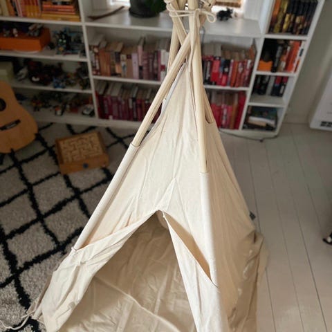 Minitude barneleketelt laget av bomull med naturlig farge. Trestokkene kan deles i to for å ta mindre plass ved lagring/frakt. Mål: 100x120cm på gulvet, 160cm høyt. (Trestokkene er 185cm i full lengde.)