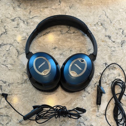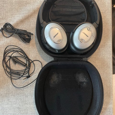 Bose QuietComfort 15 hodetelefoner med støydemping teknologi. Disse er kablet og ikke trådløse. Følger med oppbevaringsveske. Hodetelefonene har over-ear design med polstrede øreputer.