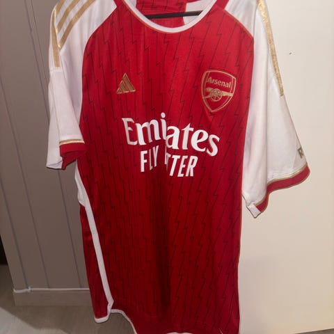 Adidas Arsenal fotballdrakt for herre i størrelse XL. Drakten har rød kropp med hvite ermer og detaljer i rødt og blått. Inkluderer nummer 19 og navnet "Pepe" på ryggen. Materiale og produksjonsdetaljer følger standard for Adidas sportsklær. Drakta er XL barn, passer fint til S.
