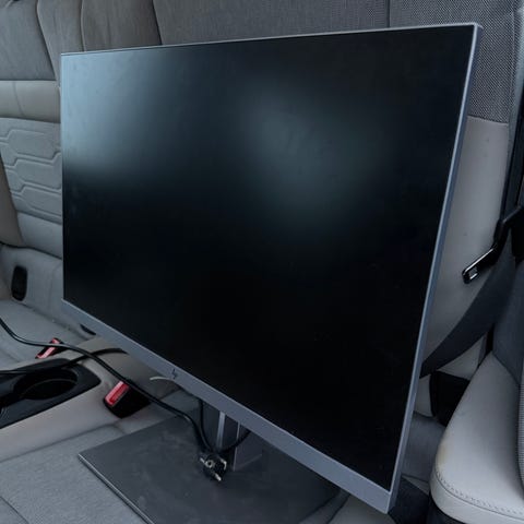 HP 24-tommers skjerm med bordfeste. Skjermen har en størrelse på 24 tommer og har vært brukt som hjemmekontorløsning.