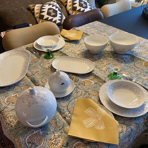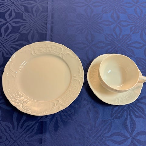 Rosenthal Claudine. Hvit, blå og gull i klassisk design. Pent brukt. middagstallerken, 25,5 cm asjett 19,5 cm og kaffekopp med skål. 12 kuverter. Til sammen 48 deler selges samlet. Kan hentes på Smestad
