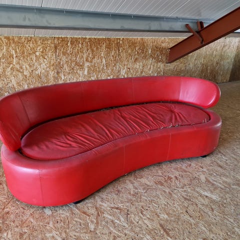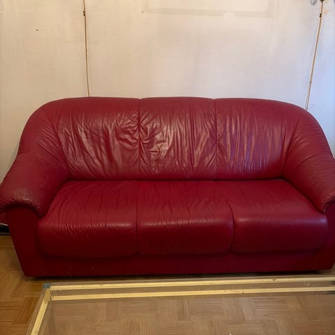Sofaen er i generelt god stand og er utrolig god å sitte i. Det er imidlertid noen hull i skinnet på selve sjeselongdelen (se bilder). Bortsett fra dette fremstår sofaen som pent brukt. Hullene kan eventuelt dekkes til med et fint skinn eller et pledd, slik vi har gjort.