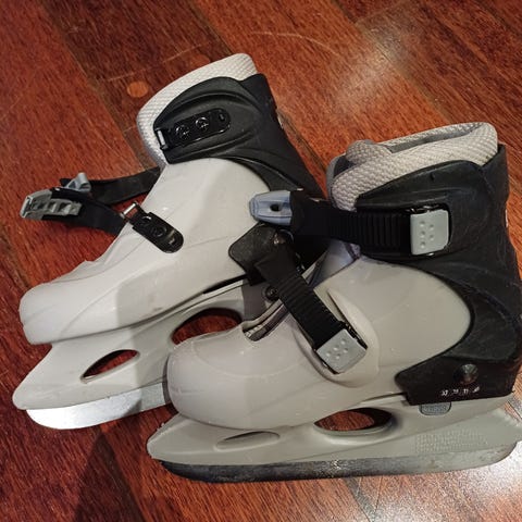 Barneskøyter i størrelse 30-33 med svart og hvit farge. Skøytene har justerbare spenner.
