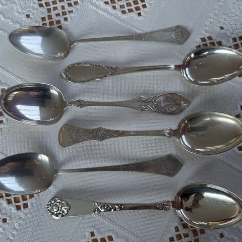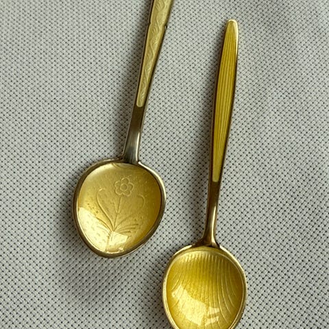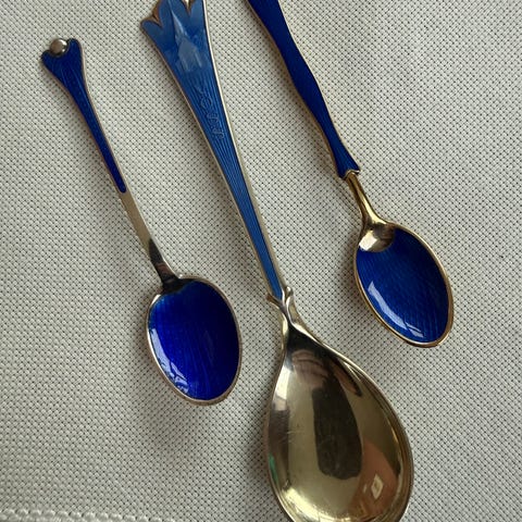 4 stk flotte 925 sølvskjeer med hvit emalje, fra David Andersen DA. Ca 9.5 cm.