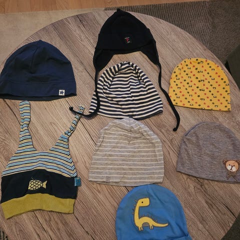 Selger 6 vinterluer til barn i str. 1–3 år, hvorav 2 er i ull.