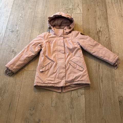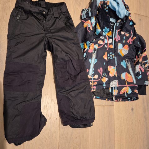 POMPdeLUX pen mørkeblå og grå-lilla mønstret vinterjakke (134-140) med mørkeblå bukse (122-128) for jente. Jakken har mønster med reflex-detaljer. Avtagbar hette. Lommer. Tykt yttermateriale som tåler vær og vind.
