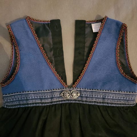 Nydelig blå bunad/festdrakt til 17.mai, med broderi og fløyelskant, og hvit tilhørende skjorte. Pent brukt, som ny.