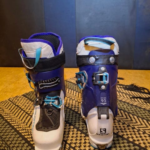 Brukte Salomon MTN S-Lab str 24/24,5 selges rimelig. Skoa er blokket i front for litt ekstra bredde. Innerstøvler har vært varmetilpasset men har vært lite brukt da jeg har brukt andre innerstøvler det meste av tiden.