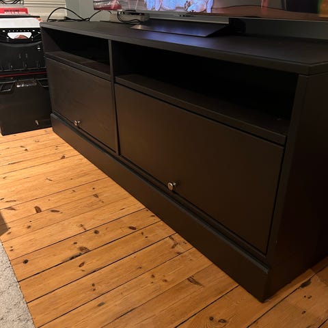 Tv-benk fra Ikea malt i fargen Sjøsmaragd. God lagringsplass og fungerer godt som tv-benk. Den skjuler kabler til Tv og kabler kan enkelt trekkes inn fra baksiden.