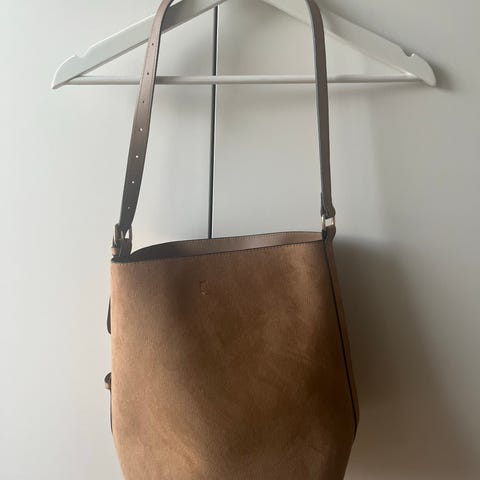 4. Liten brun veske i skinn, genuin leather, Italy står det inni den, 22* 17 cm, lite brukt kr 200,-