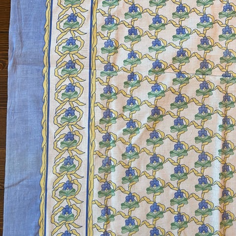 Stoff med maskinbroderte blå blomster og grønne blader - kanskje opprinnelig et gardinstoff. Et stødig og forholdsvis mykt stoff som jeg tror er et bomullsstoff. Et kvalitetsstoff.