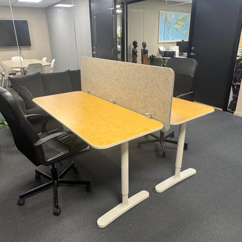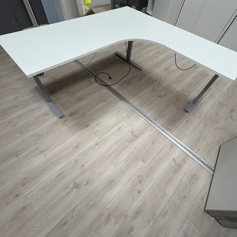 2x kontorbord i god størrelse. Kontorbordene har en form som passer i hjørner og gir god arbeidsflate. Passer til kontor- og hjemmekontorbruk.